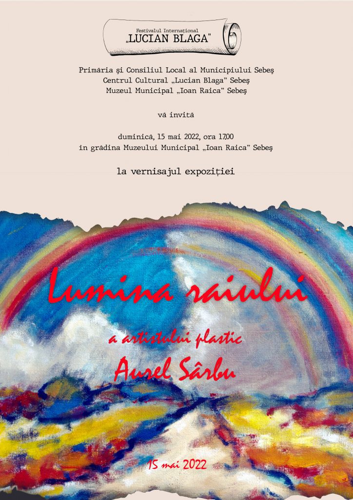 Duminică, 15 mai 2022, începând cu ora 17.00, în grădina Muzeului Municipal „Ioan Raica” Sebeș, va avea loc vernisajul expoziției de pictură „Lumina raiului” a artistului plastic sebeșean Aurel Sârbu. Expoziția reunește 24 de lucrări, reprezentative pentru activitatea de peste 30 de ani a pictorului, a căror tematică a fost inspirată de poezia și filosofia lui Lucian Blaga, precum și de lumea satului românesc.